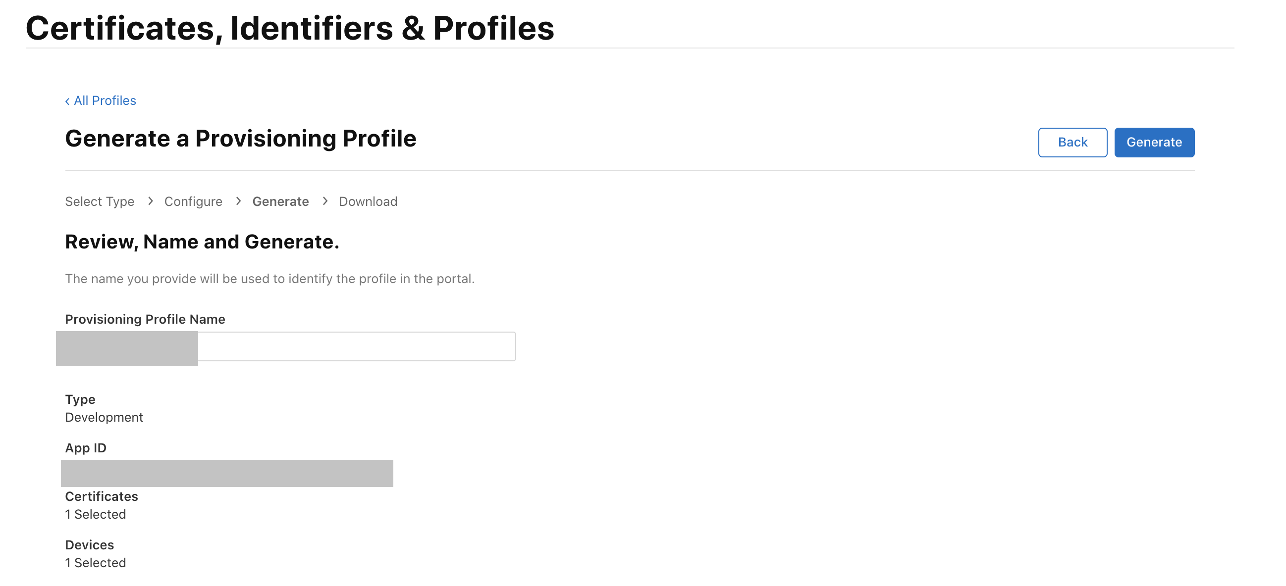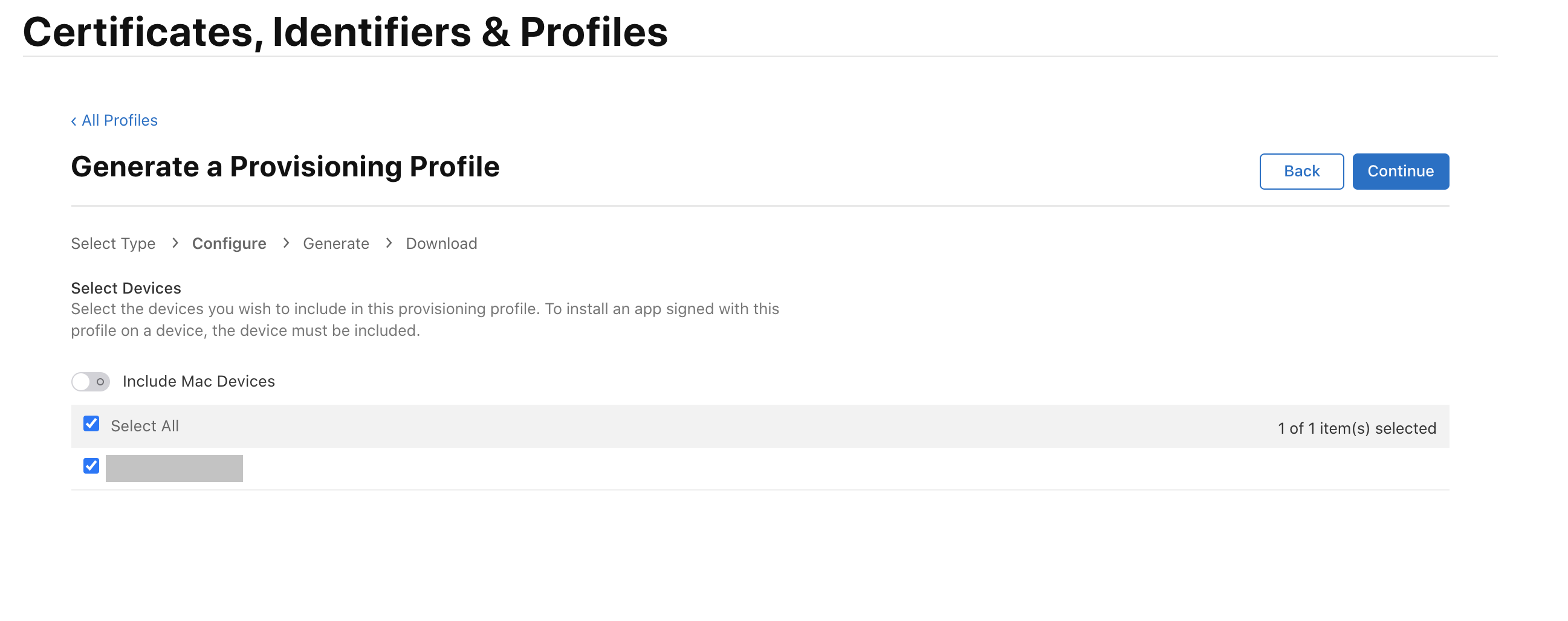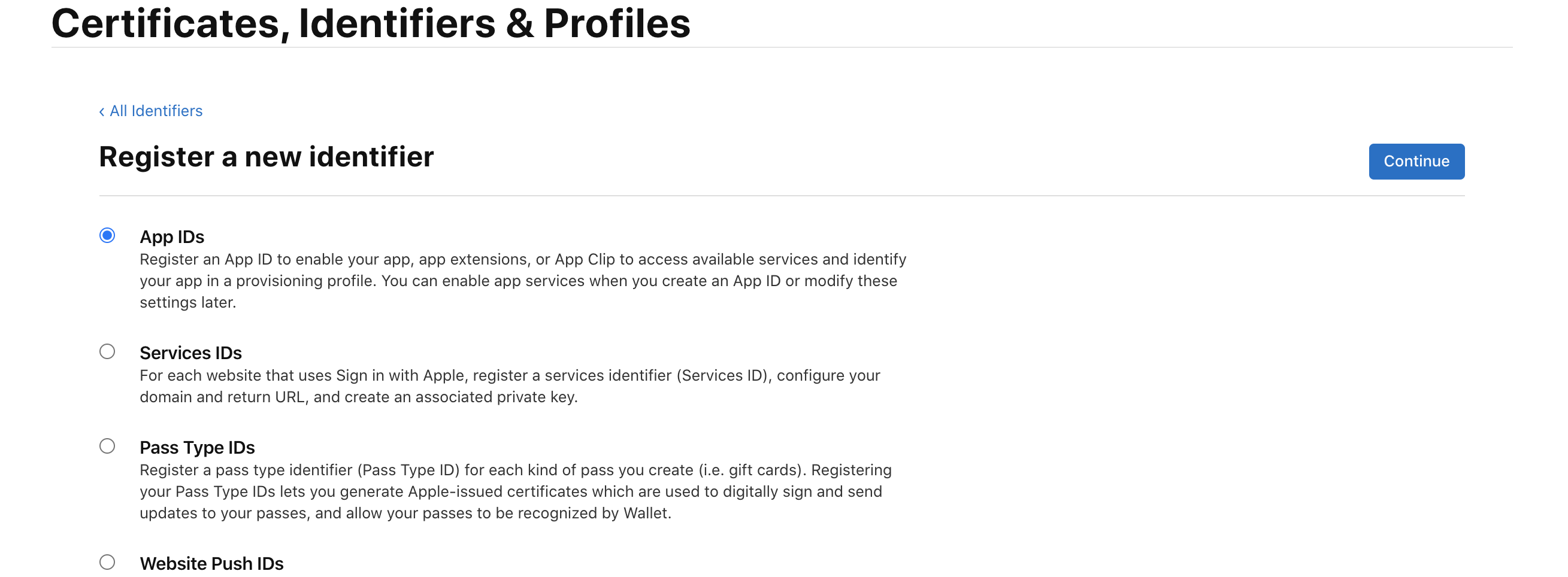 애플 개발자 페이지의 account 페이지로 들어오면 왼편에 Certificates, ID & Profile 설정 메뉴가 있습니다.