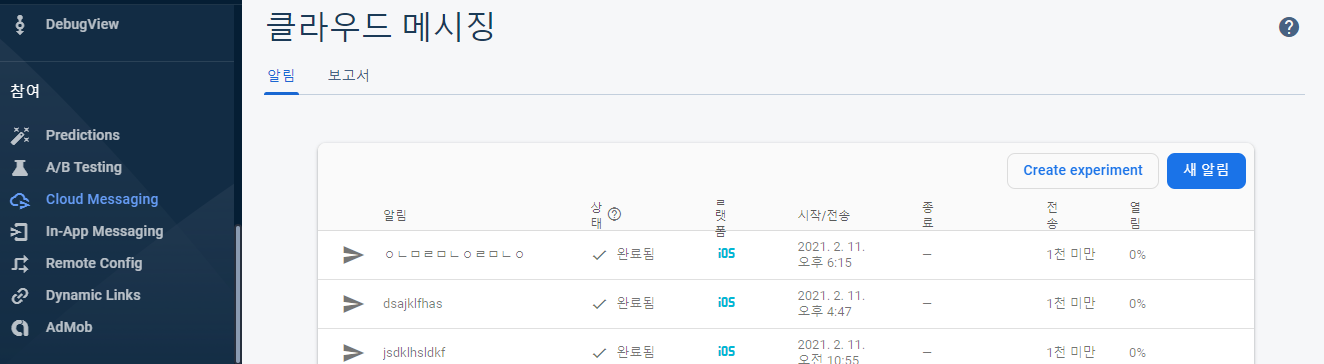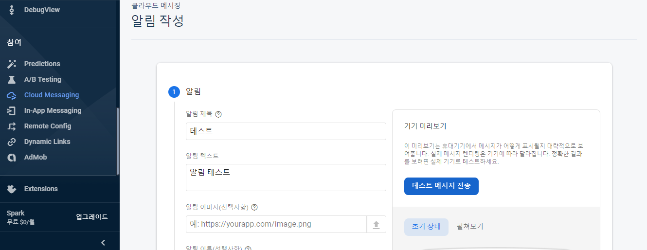 파이어베이스의 클라우드 메시징으로가서 테스트를 진행해보겠습니다.