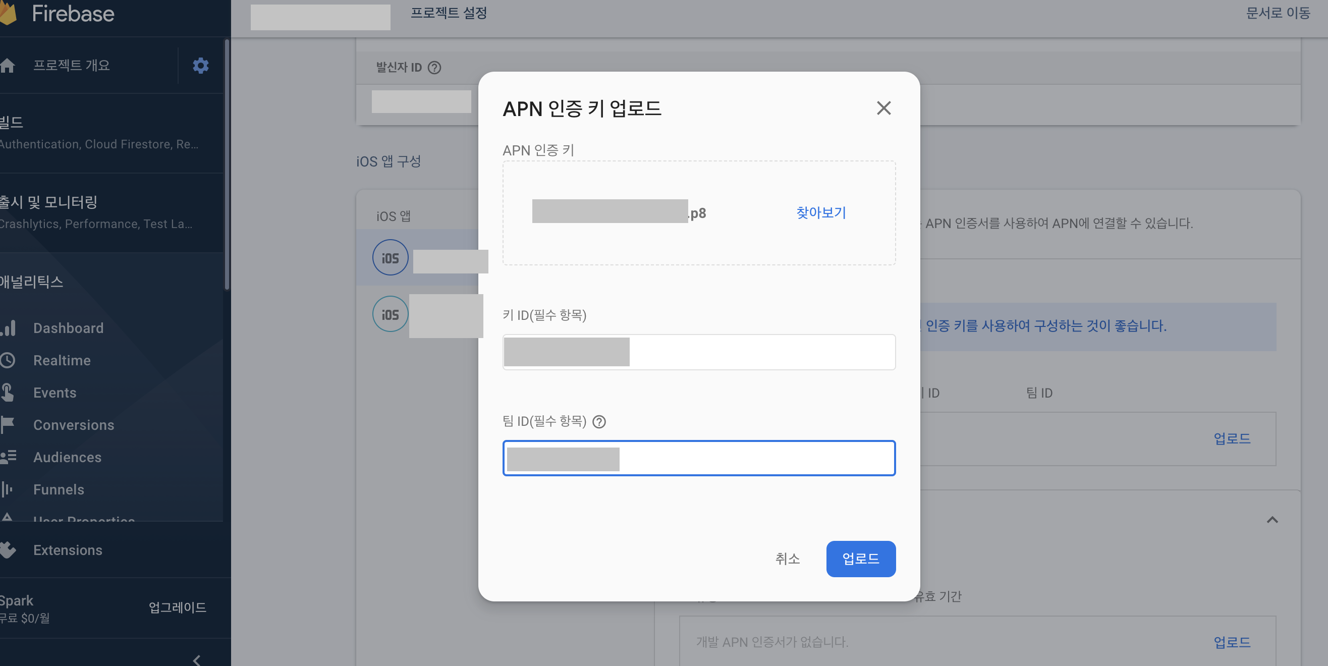 APN 인증키 부분의 업로드 버튼을 눌러주고 파일은 우리가 이전에 만든 확장자가 .p8이었던 파일을 업로드 해주시고