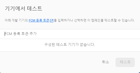 위의 페이지에서 테스트 메시지 전송을 눌러 토큰값으로 테스트를 진행할 것인데요.